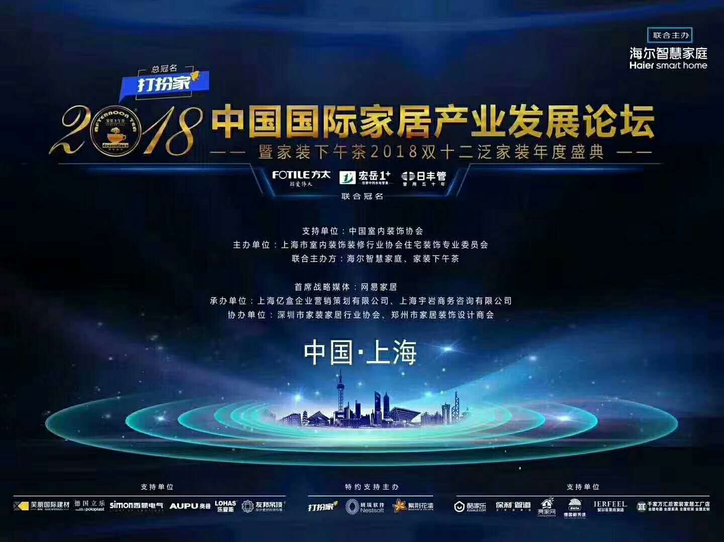 2018年12月12日-14日,2018中国国际家居产业发展论坛暨双十二泛家装年度盛典在上海隆重举行,1500余位家装精英及上下游产业大咖同场交流,分享前沿实践智慧,碰撞行业火花,完美1+作为本次活动联合冠名商荣耀亮相。