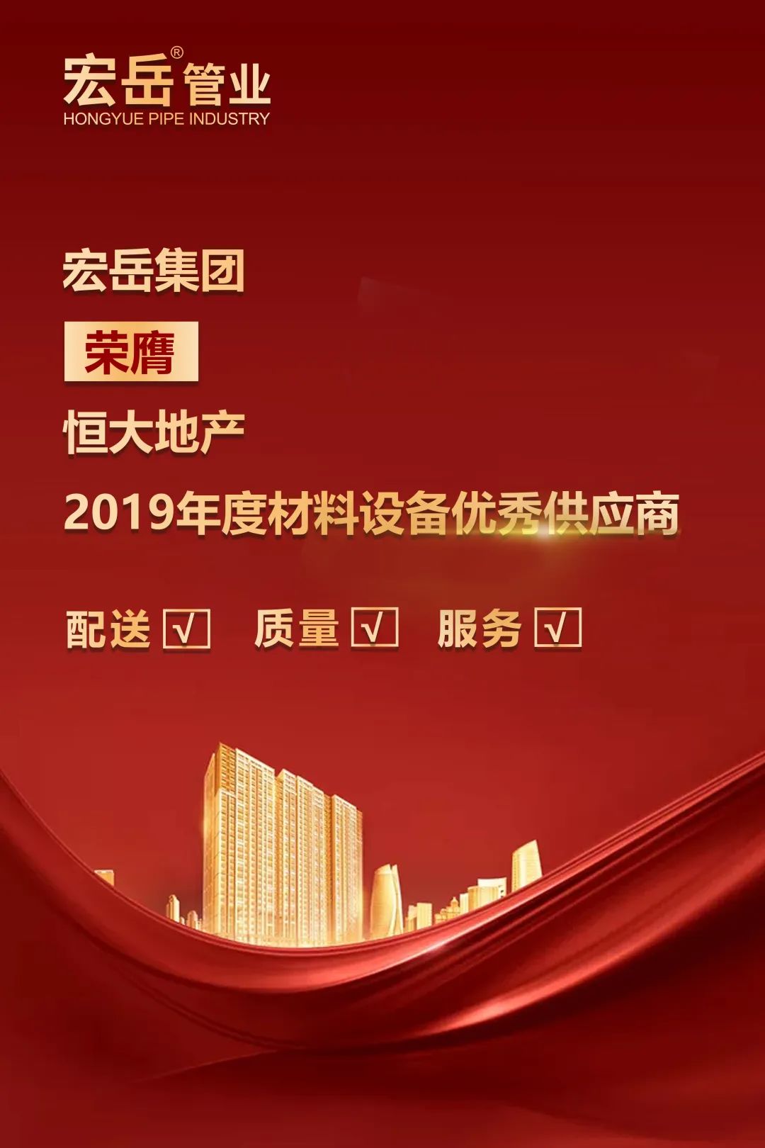 恒大地产集团作为中国最具影响力的房地产企业之一,一直以来秉持品质至上的原则,此次评选,是根据《材料设备供应商年度综合评估方案及细则》,从材料配送、产品质量、问题投诉率等多方面展开评定,完美从管材管件类品牌中脱颖而出,被客户评为产品质量和品质管控水平最高的合作伙伴之一。